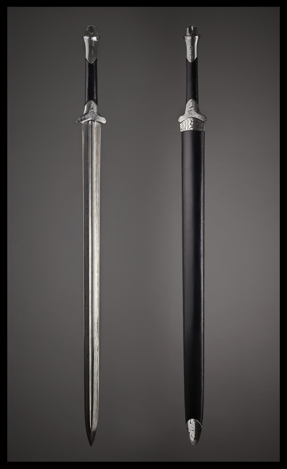 Épée, fourreau et écrin en damas, noyer et cuir.